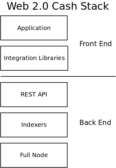The descriptions above are abstract. This section is for developers that want to know the specific software implementing the architecture. The software running the Web 2.0 architecture is documented in this Cash Stack post. Here is the new software implementing the Web 3.0 architecture: